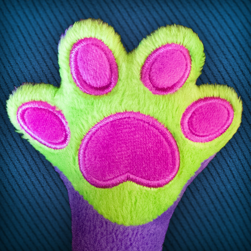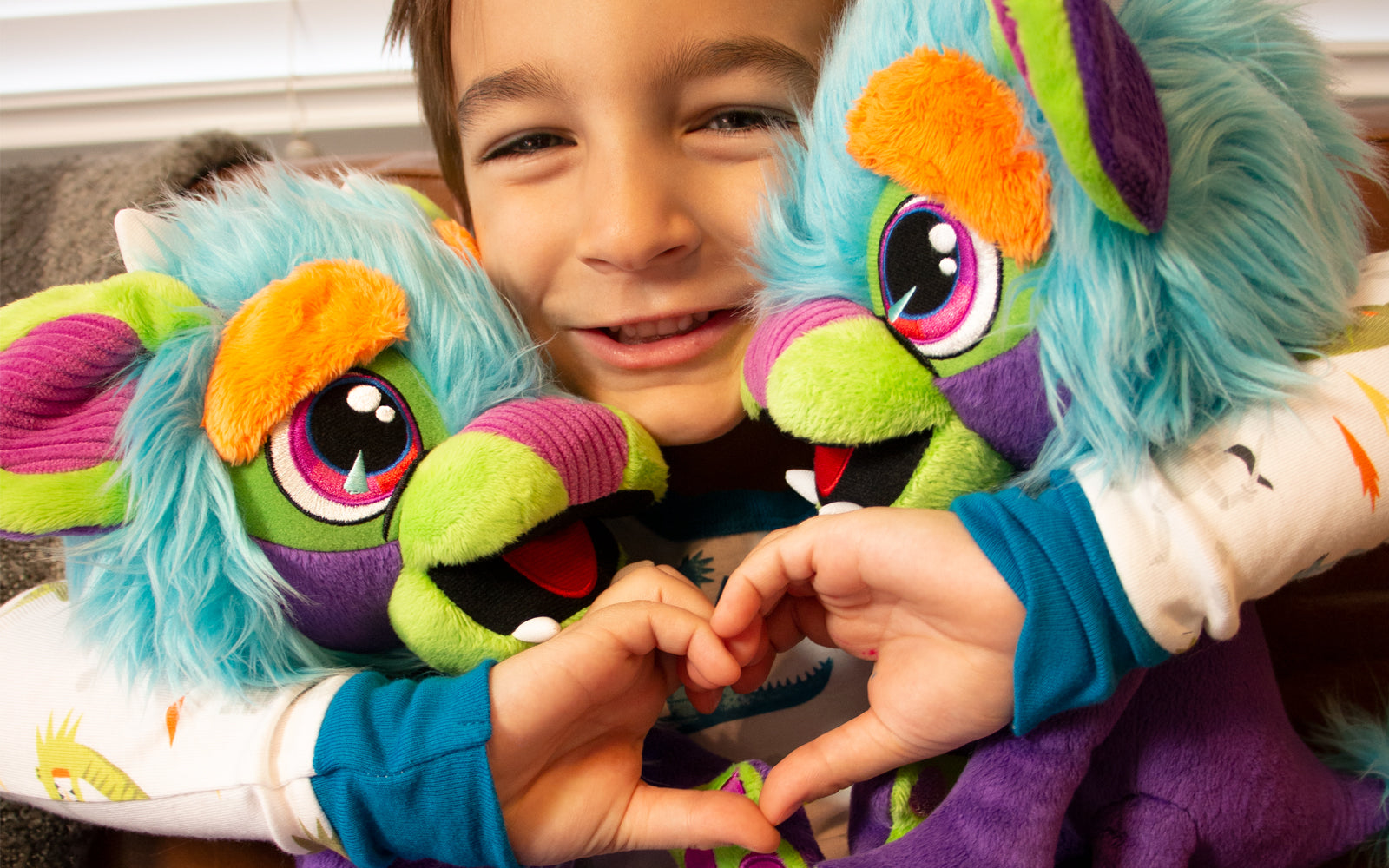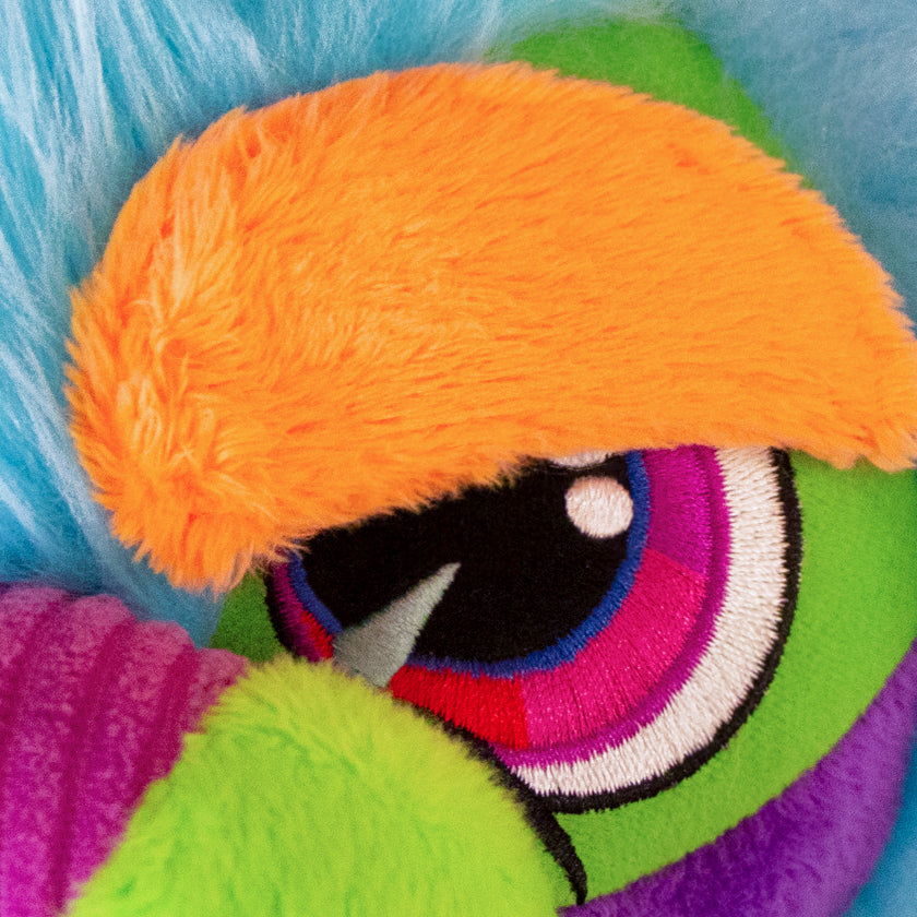 MUB loves hugs! He is made of soft minky fabric, tactile corduroy, and embroidered details accented by wild tufts of teal fur.